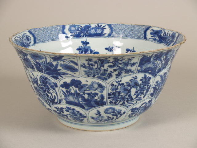 Versiering in kobaltblauw. Spiegel: landschap met vogels en bloemen. Binnenwand: 4 rotsjes met takken. Binnenrand: diamantwerk onderbroken door 5 cartouches met bloemen. Buitenwand: op elk van de petalen een bloemstuk met vogels en insecten. (Nederlands)