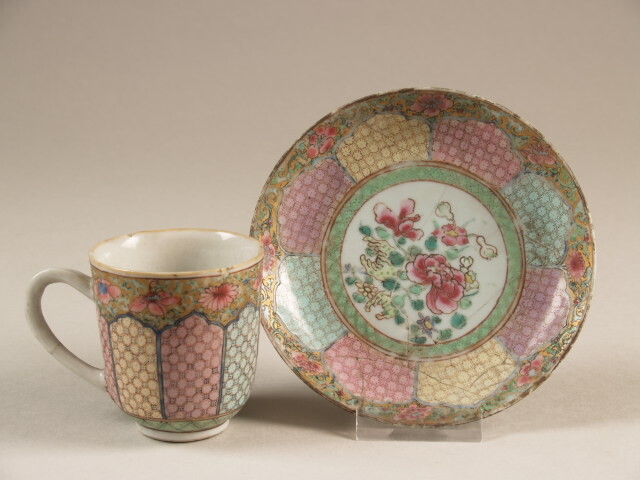 | Nederlands | Kop en schotel met decor van bloemen en vakken met ruitpatronen, famille rose |