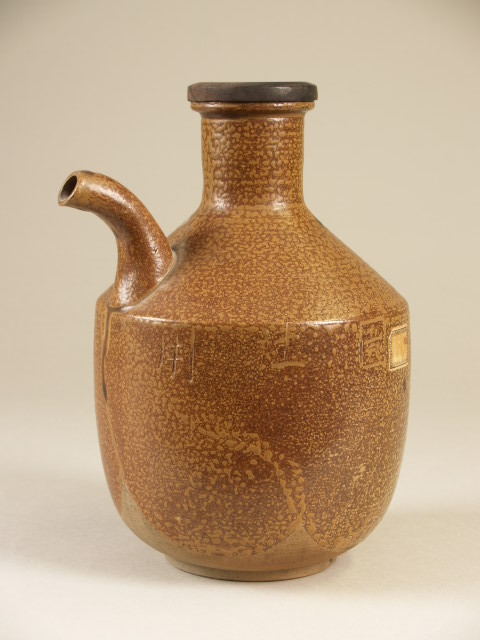 | Nederlands | Wijnkan met tuit en houten stop, voorzien van gespikkeld en druipend bruin glazuur en decor van inscripties |