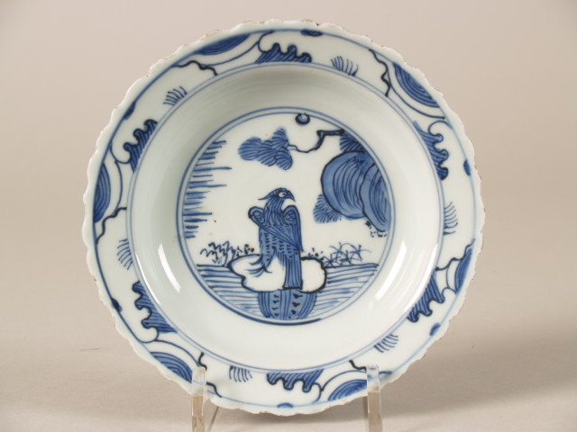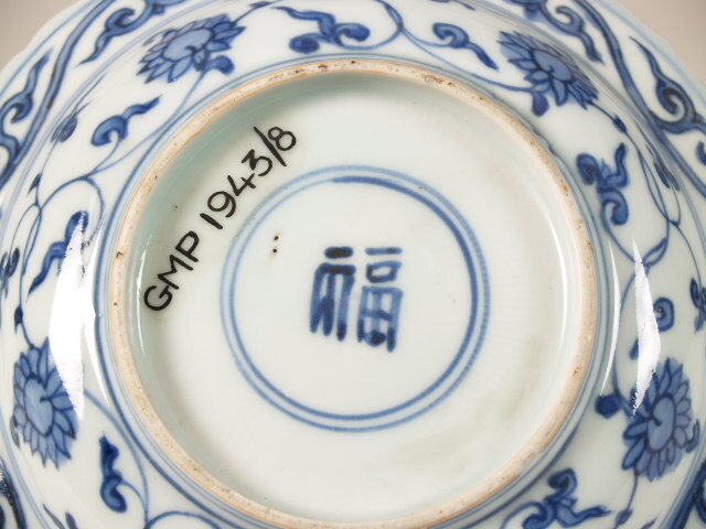 onderop de bodem in kobaltblauw in dubbele ring: de gelukwens "fu" (geluk) in zegelschrift: (Nederlands)