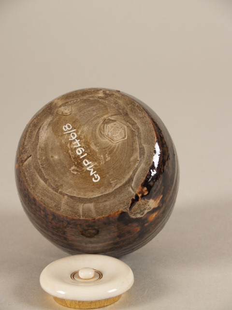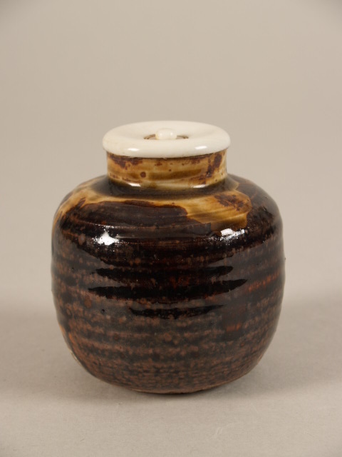 Zeer lage, recht verjongend afgesneden voet met licht konveks standvlak met itokiri; geknikt bolle wand, cilindrische rand Materiaal: lichtgrijs steengoed met gevlekt ijzerbruin glazuur; de voet en de onderste zône van de wand ongeglazuurd. Op de rand en de schouder loopt een kleurloze vlek, met lichtbruine kristallaties en donkergroene dikke gedeelten. Ivoren dekseltje; de oorspronkelijke hoes niet terug te vinden. (Nederlands)