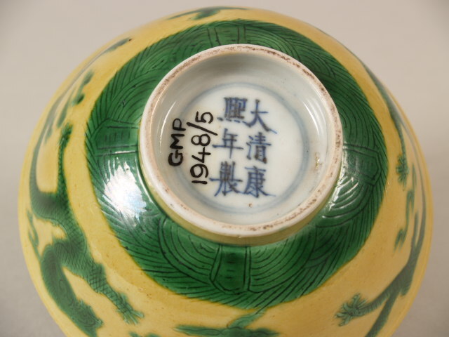 onder op de bodem in kobaltblauw onder het glazuur: vertikaal zesmerk Kangxi in dubbele ring. (Nederlands)