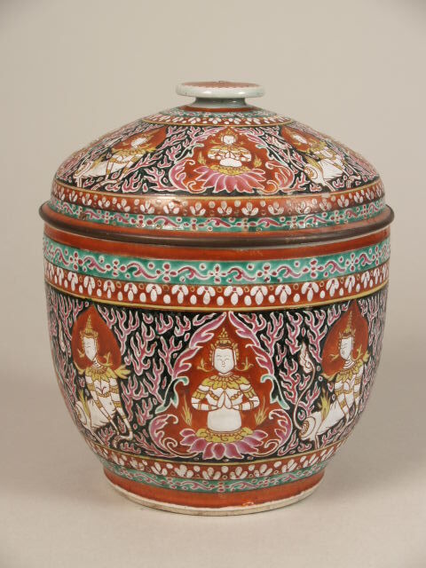 Pot met deksel met decor van gevlamde motieven en zittende figuren met een aureool, Bencharong (Nederlands)