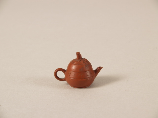 Theepotje, miniatuur, met decor van ingegrifte karakters en knop in de vorm van een bamboetakje (Q24951)
