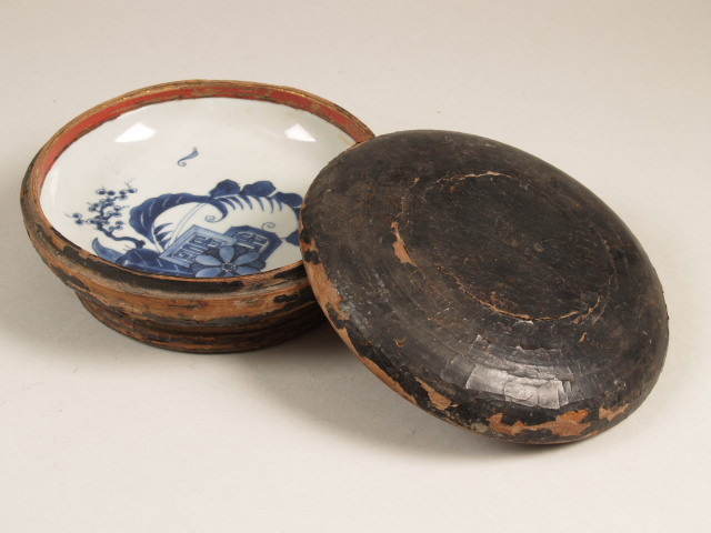 Doos van gelakt hout met porceleinen schaal met decor van symbolen en planten (Nederlands)