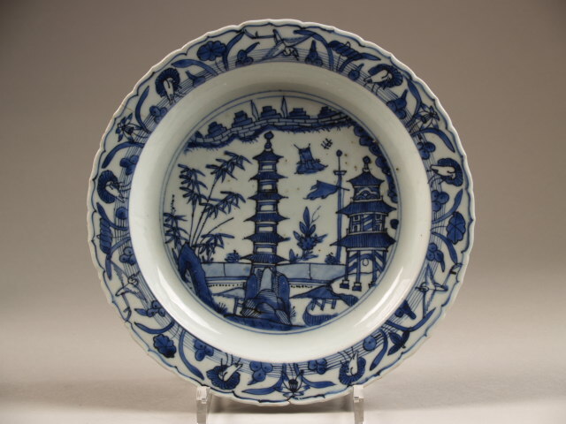 | Nederlands | Schotel met decor van pagodes in rivierlandschap |