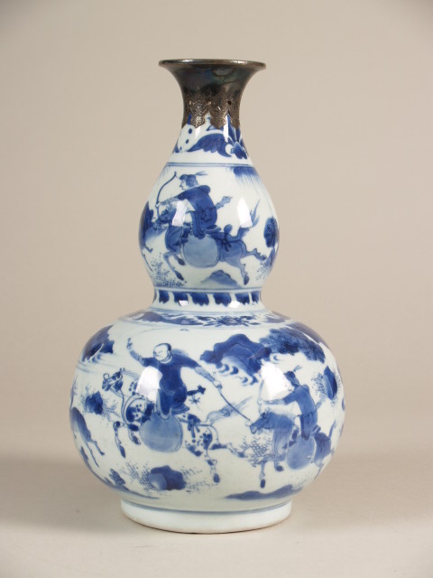 Knobbelfles beschilderd in onderglazuur blauw. Op de buik en bolle hals een decor van ruiters in een lanschap die jagen op herten. Tussen de buik, hals en bij de mond een decor van bloemranken. Blauw-wit Deze decoratie van het jagen op herten heeft een symbolische betekenis, die staat voor de wens 'dat je hoge waardering mag ontvangen/hoge positie mag krijgen' (de lu, 得鹿). Het hert (鹿, lu) heeft in het Chinees eenzelfde uitspraak als het woord voor waardering/salaris (祿), in deze context het succesvol zijn als ambtenaar wat zorgde voor rijkdom en eerbetoon. (Nederlands)