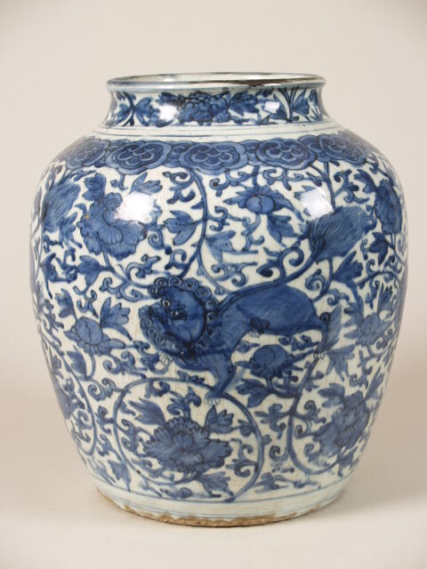 Pot versierd met boeddhistische leeuwen omgeven door krullende bloemranken (Q25086)