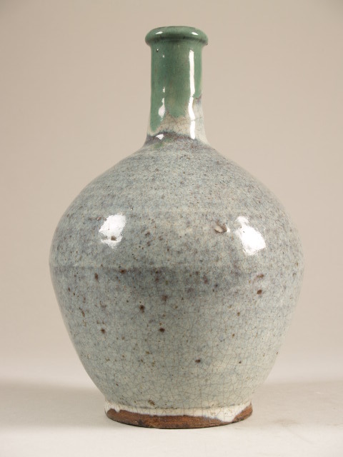 Fles bedekt met gespikkeld blauw-grijs glazuur op de buik en groen op de hals (Nederlands)
