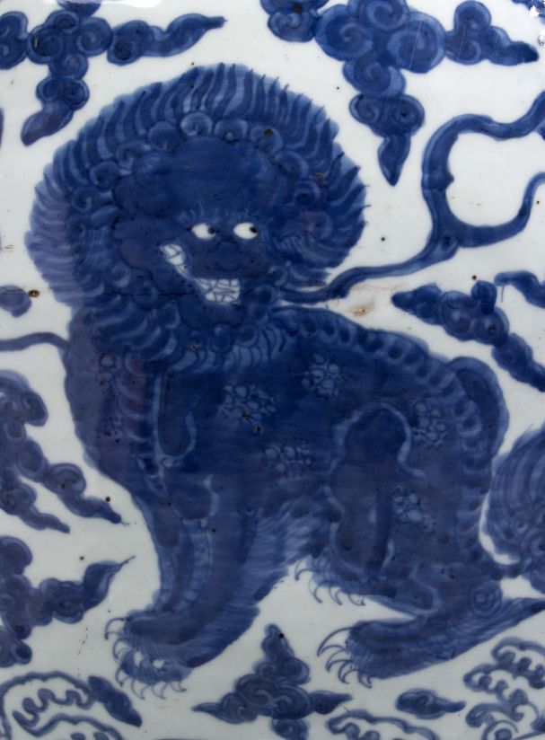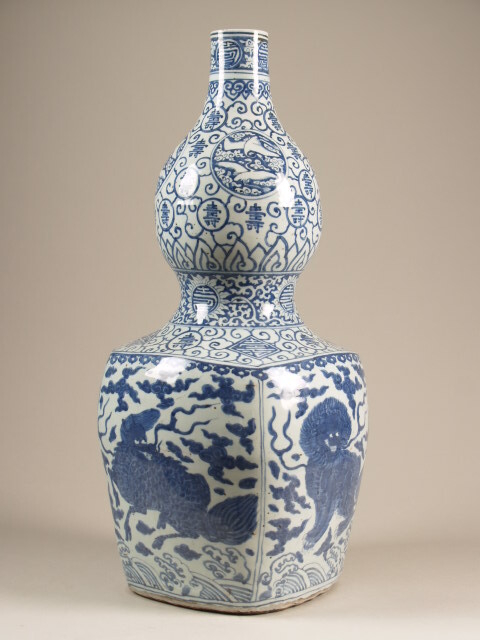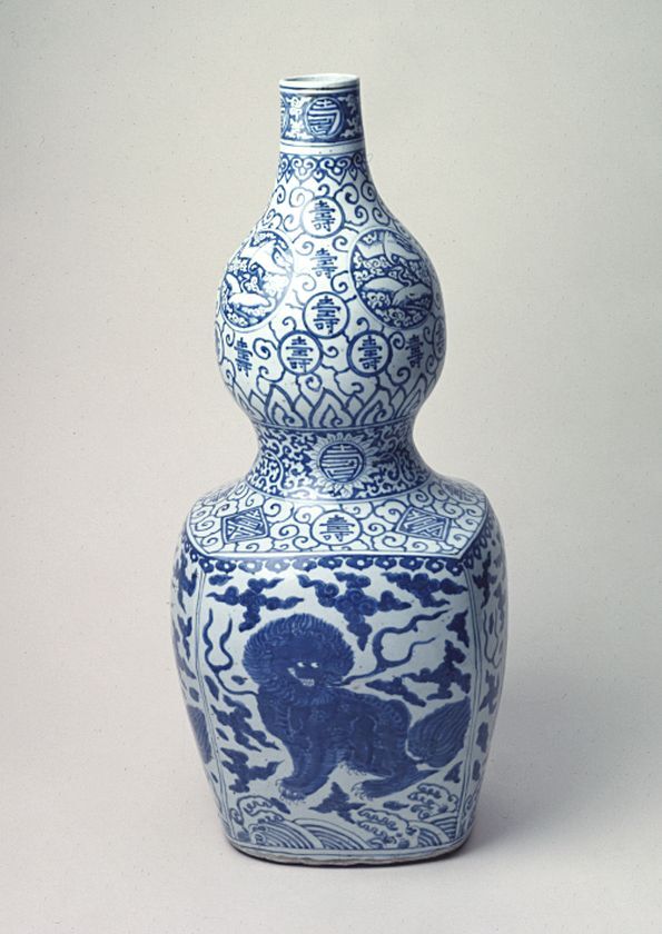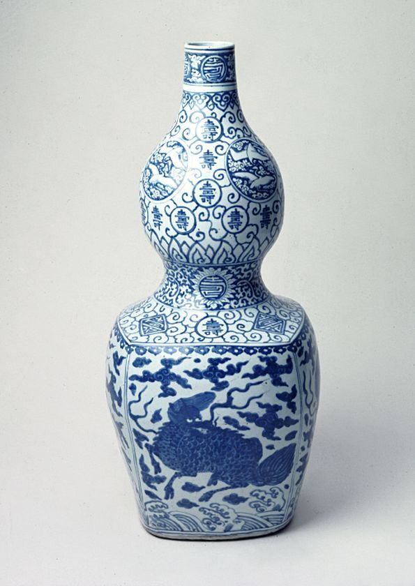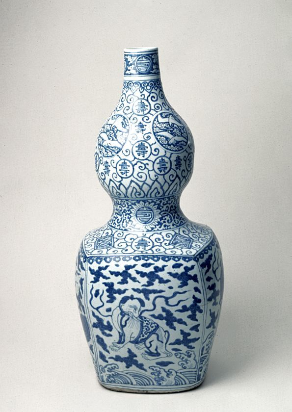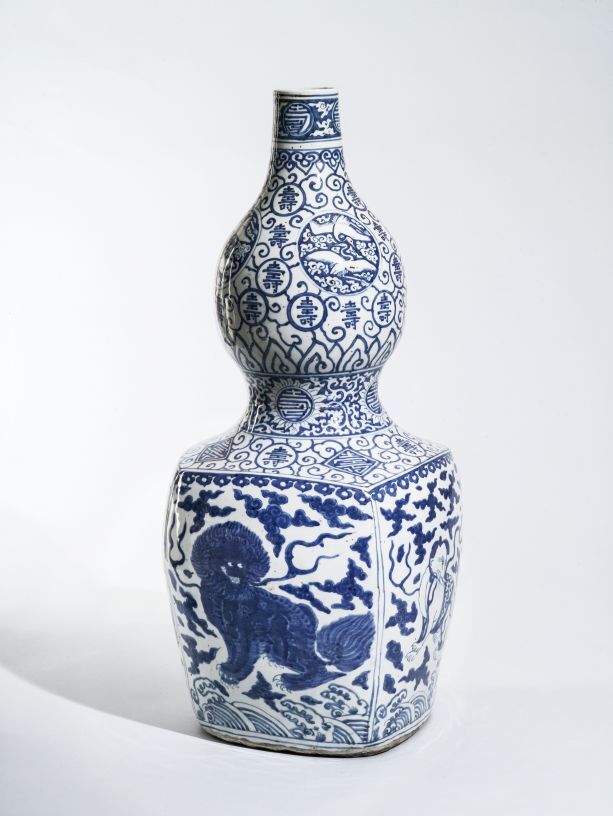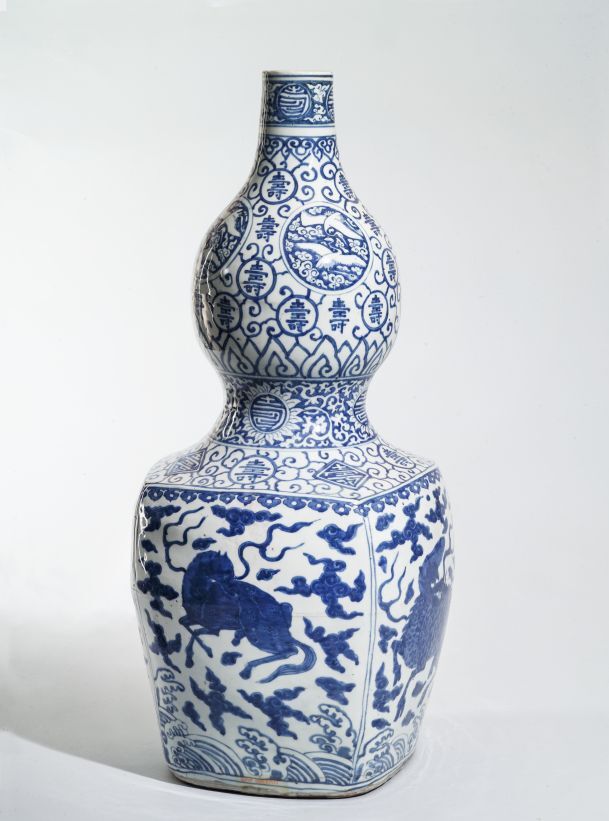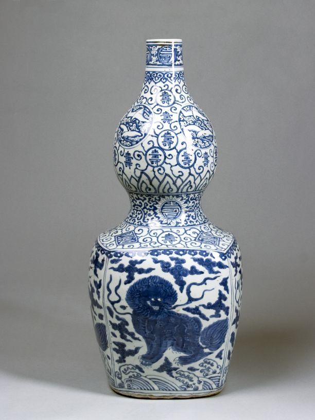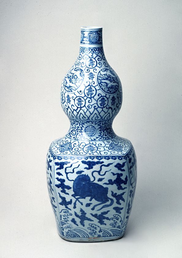Fles in de vorm van een dubbele kalebas gedecoreerd in onderglazuur blauw. Op de vier zijden staan verschillende dieren die staan op water: een olifant, leeuw, paard en qilin. De dieren zijn omgeven door ruyi-wolken. Op de bovenkant van de fles staan medaillons gevuld met kraanvolgels en daaromheen in totaal veertig shou-karakters. Al deze symbolen referen naar de wens voor een lang leven. De dieren op het water verwijzen naar het verhaal Shanhai jing (Classic of the Mountains and Seas), een mythologisch verhaal uit de late Zhou of Westelijke Han. Mogelijk zijn de decoraties gebaseerd op houtblokprinten van het verhaal die erg populair waren tijdens de Ming dynastie, met name onder de keizer Jiajing. (Nederlands)