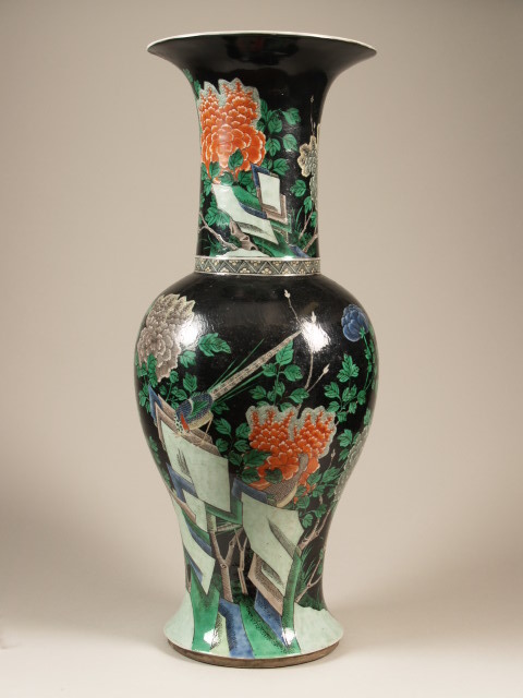 Vaas met decor van vogels en bloemen tegen zwart fond (Nederlands)
