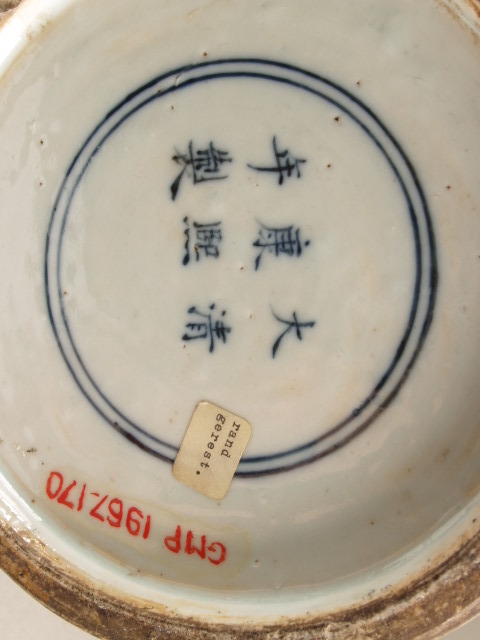 onderop in blauw onder het glazuur zesmerk Kangxi in twee horizontale regels binnen dubbele cirkel (Nederlands)