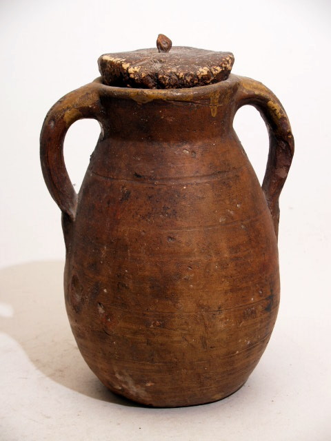 Pot, onderdeel van een pot met deksel van kurk, rechte bodem, peervormige wand met recht spreidende rand, bruin aardewer...lekken extern langs de rand. Kurken deksel met houten knopje.||Marokko||onbekend||Keramiekmuseum Princessehof QGMP 1968-033 |