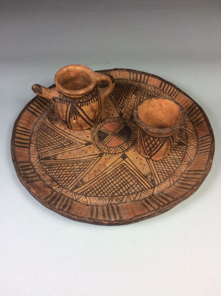 Servies op blad, bestaande uit een schenkpot, kan en kop van ruraal aardewerk met Amazigh patronen (Nederlands)