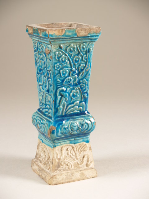 Vaas, vierkant, met decor van bloemen in reliëf en grotendeels met turkoois geglazuurd (Nederlands)
