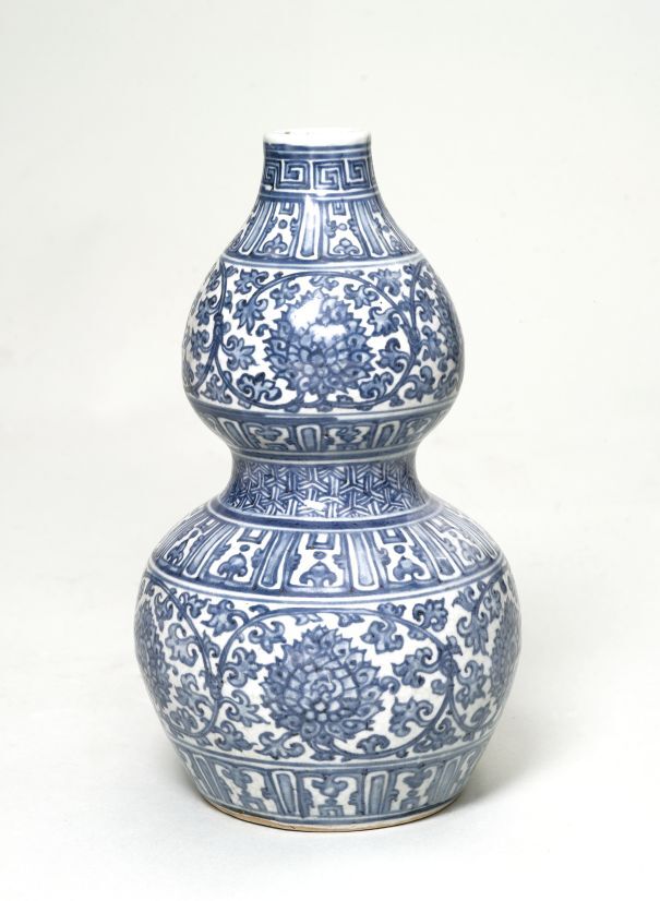 Kalebasfles beschilderd in onderglazuur blauw opgedeeld in verschillende horizontale banden van decoraties: ruyi, lotusranken en geometrische patronen. Blauw-wit (Nederlands)