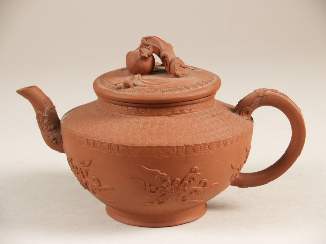 Theepot met appliqé decoratie van planten en bloemen. De vorm is vrij ongebruikelijk voor Yixing. Het gebruik van appliqé decoratie op Yixing theepotten voor de Westerse markt wordt vooral toegepast in de Kangxi en in minder mate in de Qianlong periode. Daarna is hier blijkbaar geen vraag meer naar. Het deksel past niet goed en hoort waarschijnlijk niet van oorsprong bij deze theepot. (Nederlands)