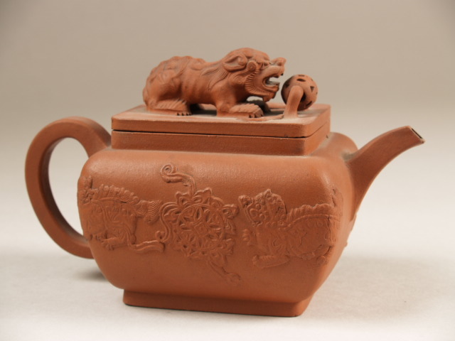 Theepot, rechthoekig, met leeuw op het deksel en decor van boeddhistische leeuwen in reliëf (Nederlands)