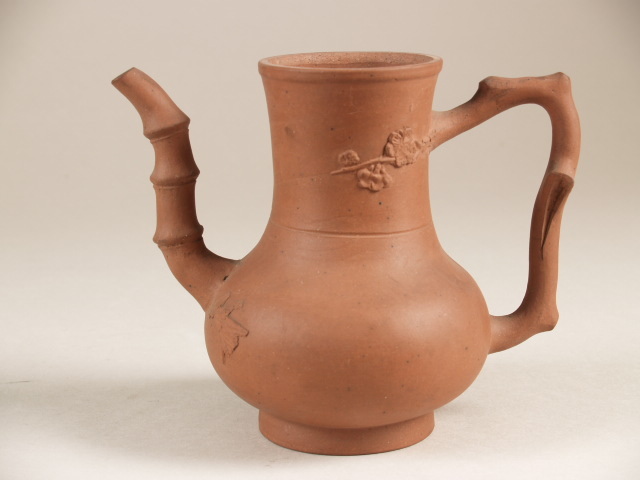 Theepot met appliqué decoratie van bloemen, wat kernmerkend is Yixing theepotten uit de Kangxi periode. Handvat in de vorm van een tak, tuit in de vorm van een bamboe scheut. Vrij grof van vorm en decoratie. (Nederlands)