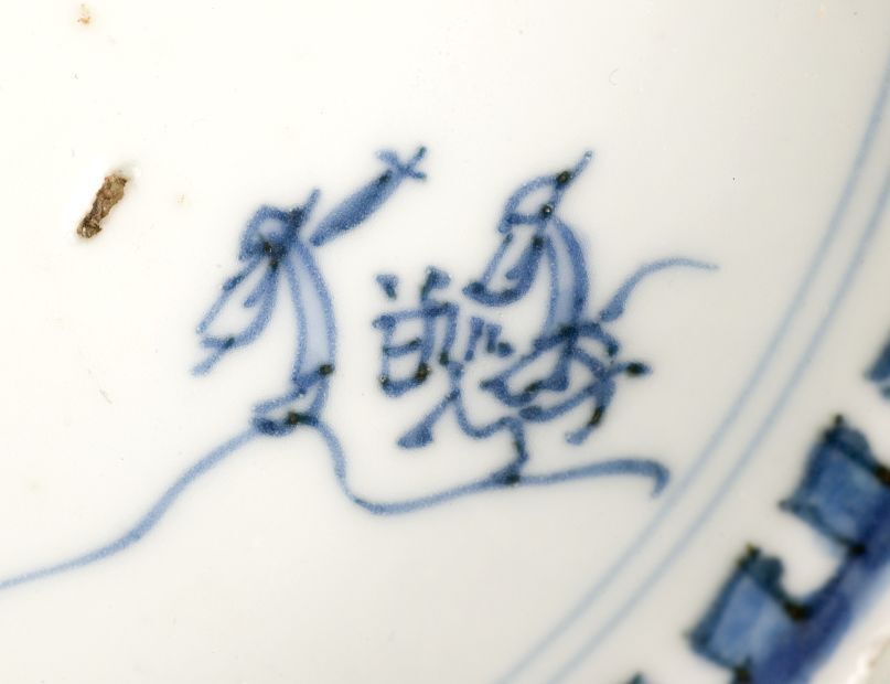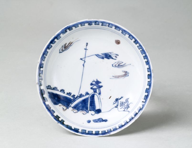 Bord met een landschap in onderglazuur blauw en rood. Twee figuren, waarvan één te paard, lopen richting een fort/stadsmuur met een toren. Op de muur staat een vlaggepaal waaraan een windvaan waait. Op de rand van het bord bevindt zich een dubbele lijn en een gekartelde rand. Dit type porselein staat in Japan bekend als ko-sometsuke en het werd in China speciaal voor de Japanse markt vervaardigd in het midden van de 17de eeuw. (Nederlands)