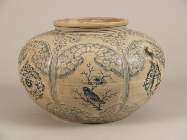 Pot met decor van vlakken waarin vogels en bloemen (Q25230)