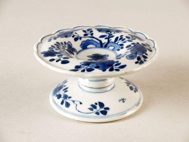 Zoutvat met golvende rand, rond op voet, met decor van bloemtakken (Nederlands)