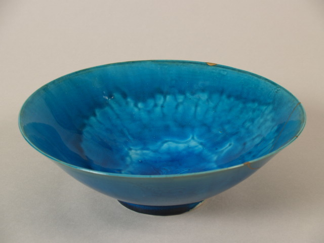 Kom met turquoise glazuur en aan de buitenkant een ingegrifte decoratie. (Nederlands)