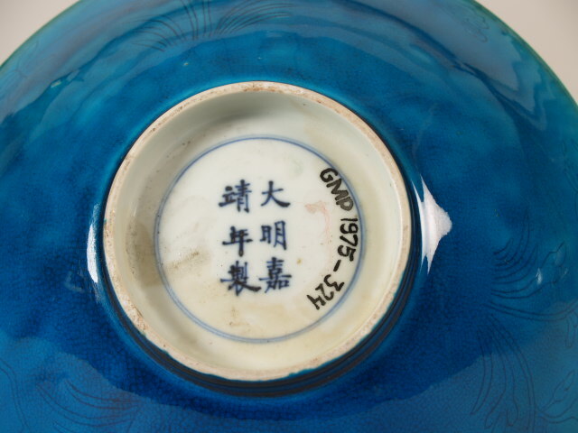 onder op bodem in blauw onder glazuur: 6-karakters merk Chia Ching binnen 2 cirkels (Nederlands)