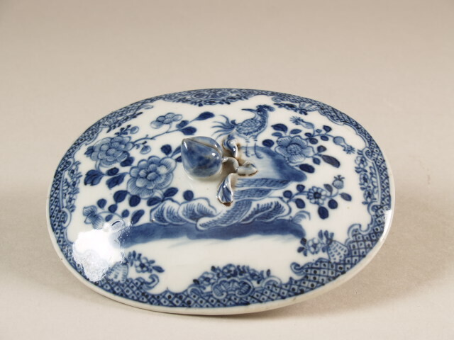 Deksel van botervloot, ovaalvormig, met decor van bloemen en haan (Nederlands)