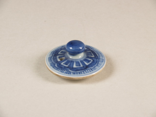 Deksel van theepot met ronde knop en decor van vakjes en strepen (Q25302)