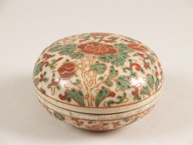 Doos, rond, met deksel en polychroom decor van bloemen (Nederlands)