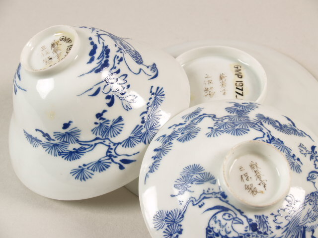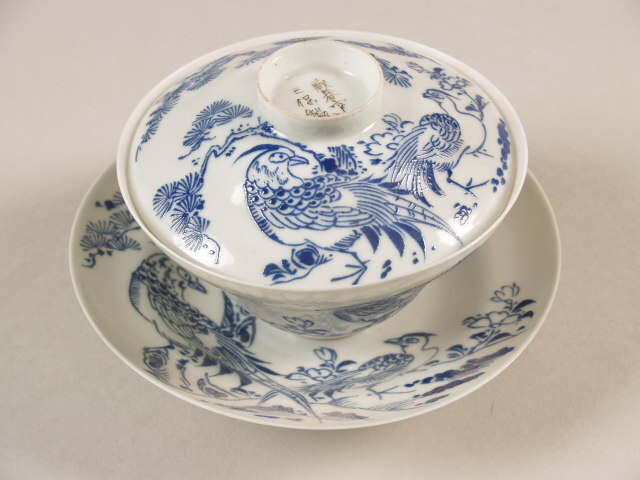 Matching cover bowl and saucer of translucent porcelain, handle and footringe each enclosing six identical charactermarks painted in black ove white glaze. The exterior of the bowl and its cover, and the interior of the saucer, are painted in overglaze blue with cock and hen pheasant supported by pine and flowering branches. (Nederlands)