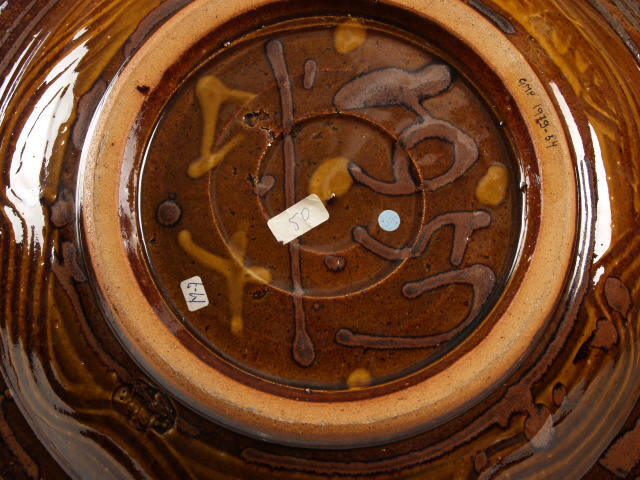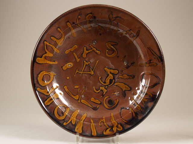 Schotel met deocr van dikke letters en tekens op bruin temmoku-stijl achtergrond (Nederlands)