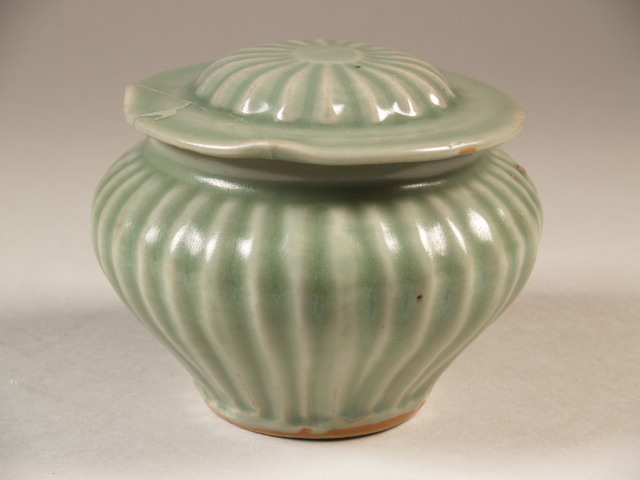 Pot met deksel in de vorm van lotus blad, radiale ribben, celadon (Q25462)