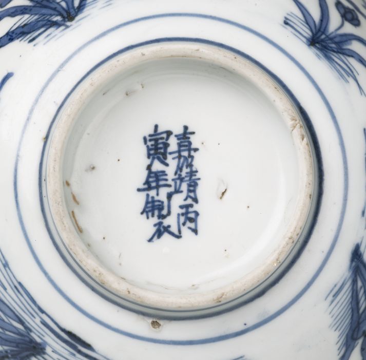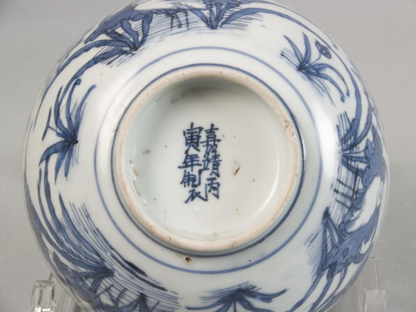 the cylindrical date-mark is in two rows of characters painted in blue on the base: Jiajing bingyin - nian zhi (Nederlands)