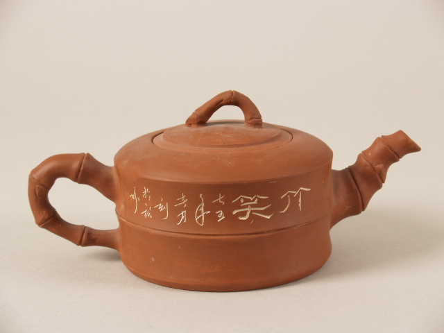 De pot heeft de vorm van een geleed stuk bamboe; oor, tuit en dekselknop zijn van gebogen dunne delen. Op de binnenrand van de pot rust een bakvormig zeefje terwijl in de wand nog eens een uit vijf gaatjes bestaande stervormige zeefverbinding naar de tuit is aangebracht. Op de ene zijde van de pot is wat bamboe ingesneden, op de andere een opschrift; beide zijn met wit slip verduidelijkt. Als verschillen met Yixing vallen het volledig ontbreken van een korrelige oppervlakte structuur, een matte, haast orange kleur, en de aanmerkelijk slechtere afwerking op. (Nederlands)