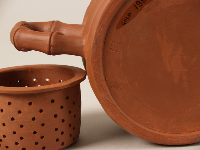 Nummer GMP 1981-213.A is de theepot, B is het zeefje en C het deksel.||De pot heeft de vorm van een geleed stuk bamboe; ..., haast orange kleur, en de aanmerkelijk slechtere afwerking op.||China||Guangxi||Keramiekmuseum Princessehof QGMP 1981-213