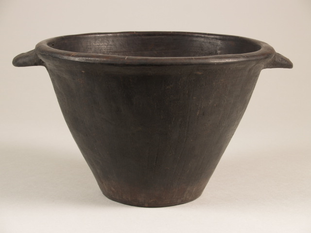 Trechter van zwart aardewerk met 2 handvaten en decor van ingegrifte lijnen (Nederlands)