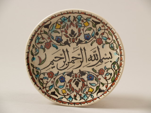 Bord met decor van arabesken en het opschrift (in Arabisch): 'In de naam van god de almachtige'