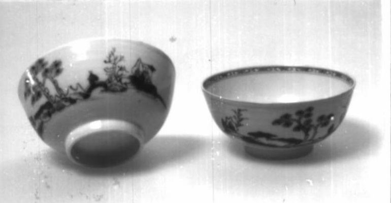 2 kommen uit de Nanking cargo zie lot. nr. 3041 en verder. Onderglazuur blauw. Decoratie van een geleerde die een bruig overloopt tussen twee rotseilanden met paviljoen en bomen waaronder de pijnboom. Aan de binnenrand van de kom een gestreepte rand. Zeer vrij geschilderd. Blauwige glazuur aangetast door zeewater. (Nederlands)