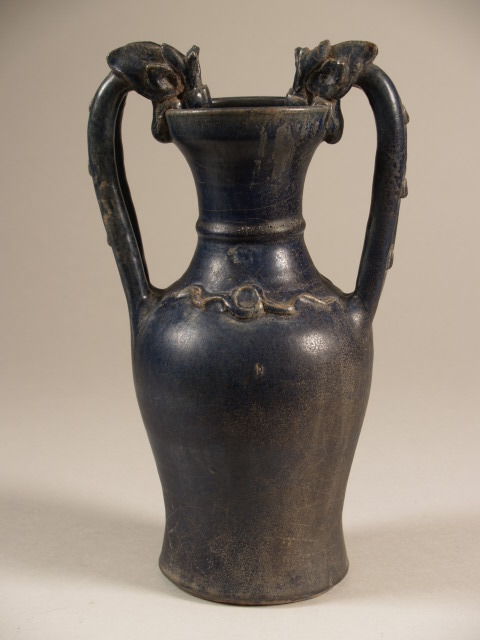 Amfoor met 2 grote oren voorzien van gecraqueleerd blauw glazuur (Nederlands)