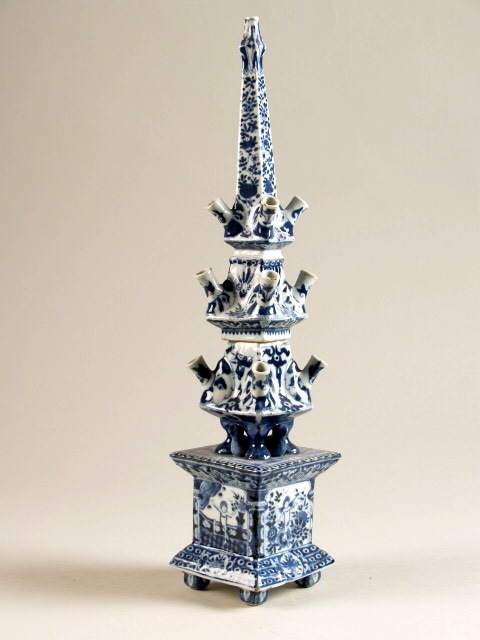 Vaasplastiek, tulpenvaas, bestaande uit vierkante basis op 4 poten, waarop piramidaal kleine openingen naar boven staan met decor van Europese voorstellingen en bloemen (Nederlands)