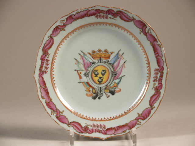 Bord met decor van familiewapen, mogelijk Pottère, famille rose