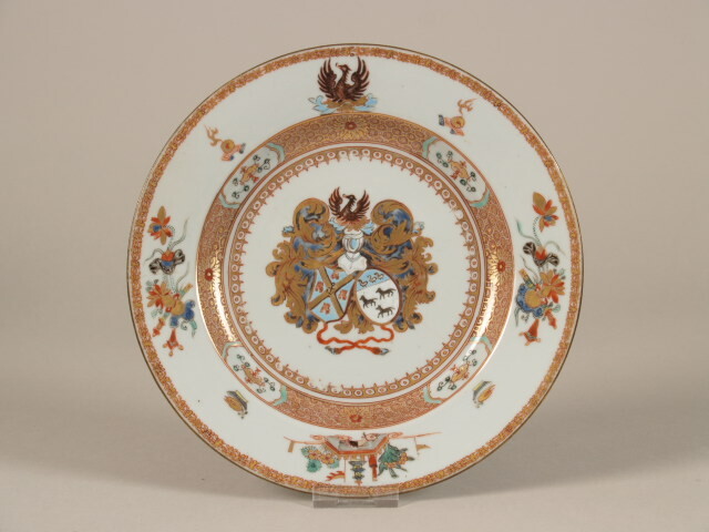 | Nederlands | Bord gedecoreerd met het alliantiewapen van de families De Neufville en De Wolff, chine de commande / imari |