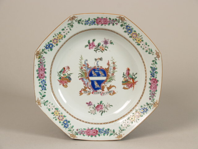 Bord, achthoekig van vorm, met familewapen Philips en opschrift Memi nisse juvabit (Het zal helpen om te onthouden), chine de commande, famille rose. Het afgebeelde wapen is dat van de familie Philips. (Nederlands)