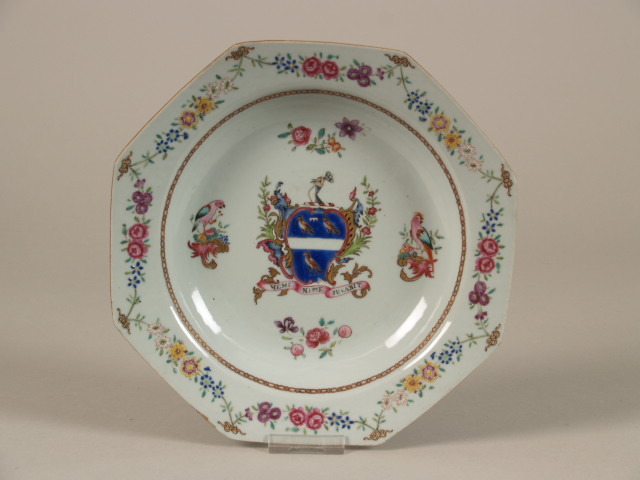 Bord, achthoekig van vorm, met familewapen Philips en opschrift Memi nisse juvabit (Het zal helpen om te onthouden), chine de commande, famille rose. Het afgebeelde wapen is dat van de familie Philips. (Nederlands)