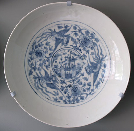 | Nederlands | Schotel met decor van pagodes omgeven door een band met feniksen, Zhangzhou (Swatow) |