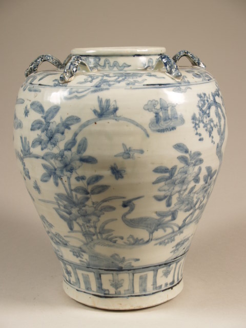 Pot met 4 handvatten met decor van tuinlandschap (Q25657)