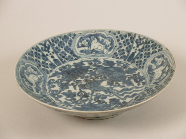 Schaal op voet met decor van feniks tussen bloeiende planten en op de rand cartouches met hazen op een geometrische ondergrond (Nederlands)