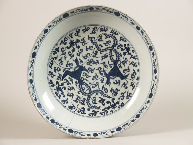 Schotel met decor van 2 feniksen temidden van bladranken (Q25674)